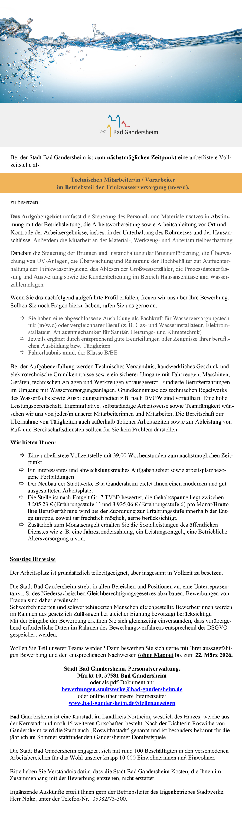 Technische/r Mitarbeiter/in, Vorarbeiter/in im Betriebsteil der Trinkwasserversorgung (m/w/d) - Stadt Bad Gandersheim
